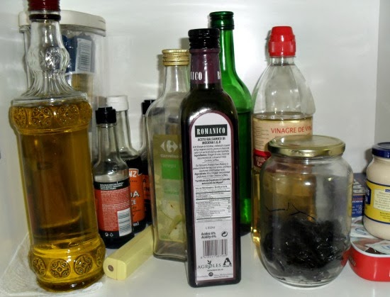 En un principio pensé en quitar las etiquetas originales al vino para cocinar, al vinagre de todo trote y a los botes de salsa de soja y Worcestershire, pero despues de todo lo que pené quitando etiquetas a los otros botes me contuve, que además, son cosas que duran poco y no merecía la pena el esfuerzo.