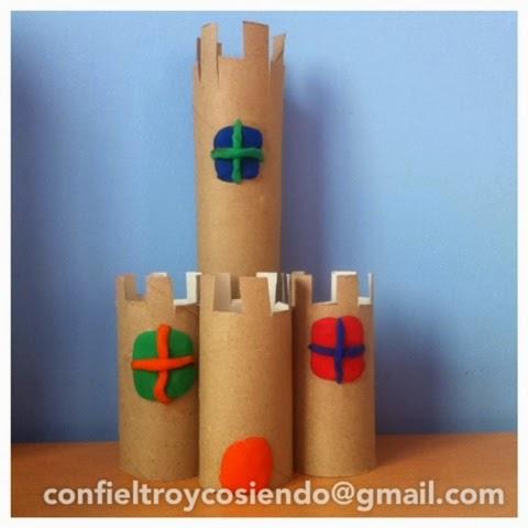 Lo primero que he hecho ha sido recortar en uno de los extremos del tubo de cartón tiras para hacer la forma del castillo. He utilizado un tubo largo y tres pequeños, así puedo poder las reglas dentro, que siempre hay problemas por las medidas.