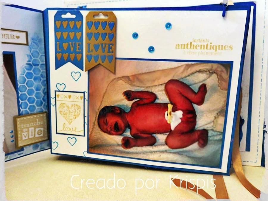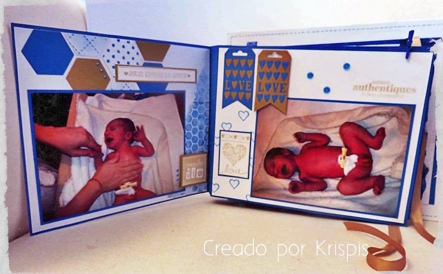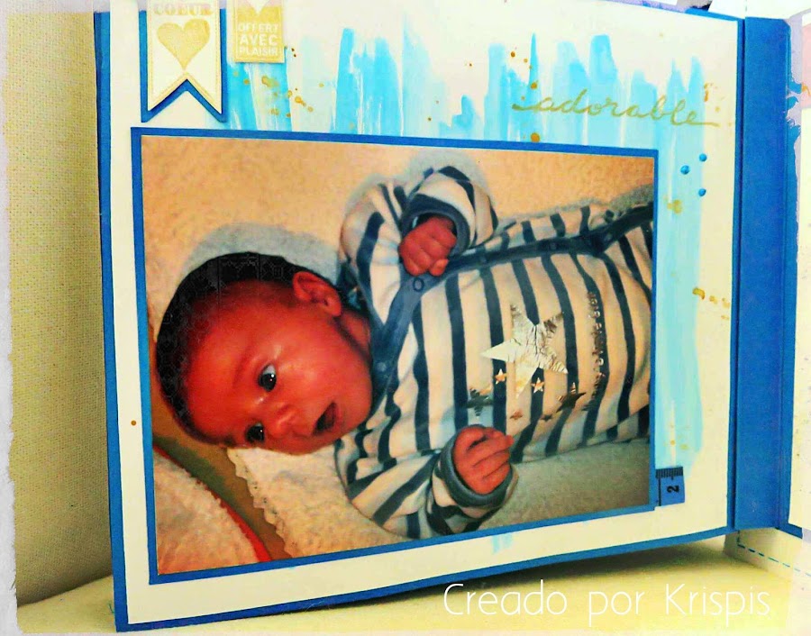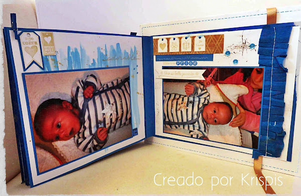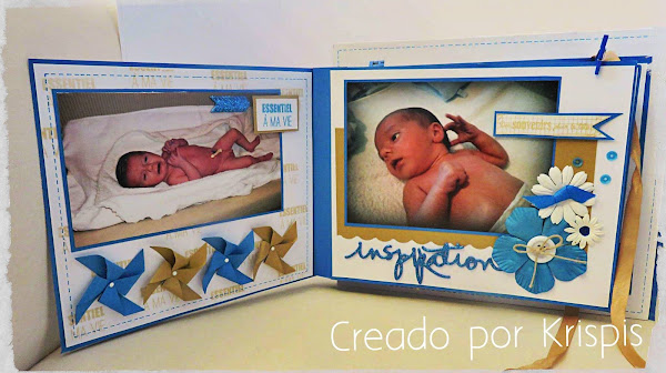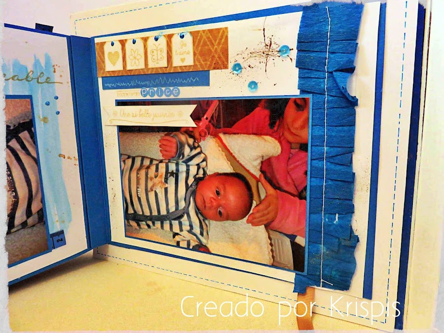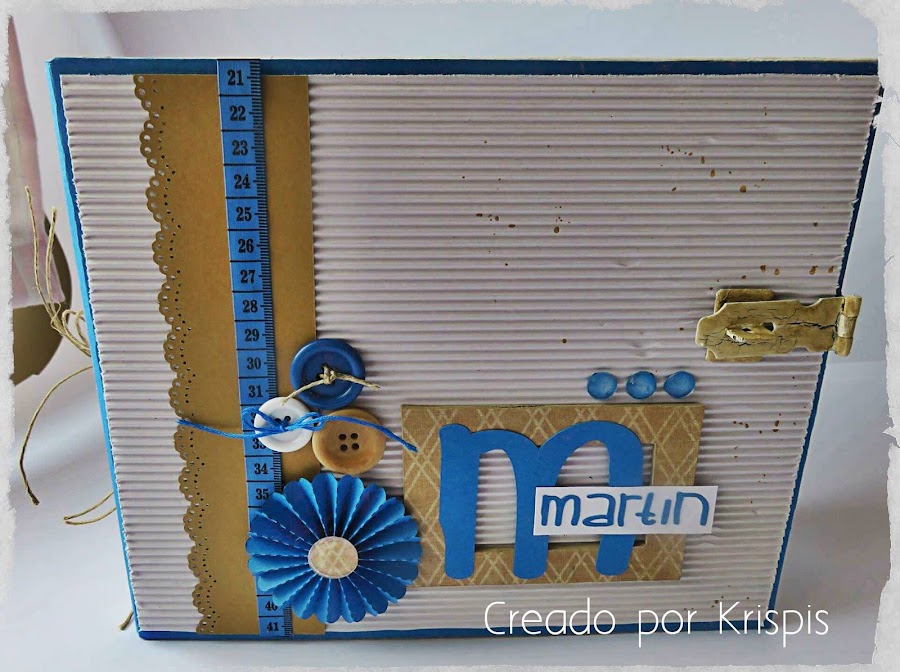He utilizado diferentes elementos en tonos azules, craft y blancos. He hecho fondos con pasta de stencil, acuarelas, sellos, me encanta combinar sobre fondo blanco esos tonos, también he usado papel corrugado, papeles de My minds eyes y elementos decorativos como botones, cintas, abecedarios... También use por primera vez las chapas y maderitas que ha creado mi amiga Leti de http://gigietmoi.blogspot.com.es/, son una pasada son de papel acuarela, para que podamos crear nuestras chapas, me encantan.