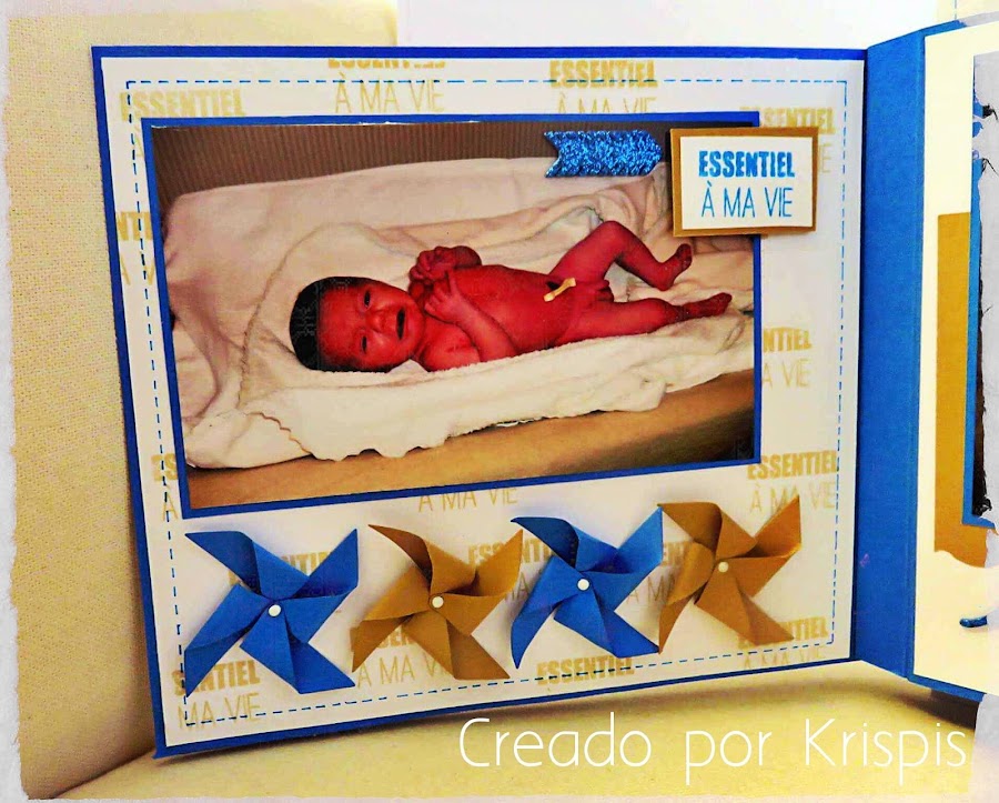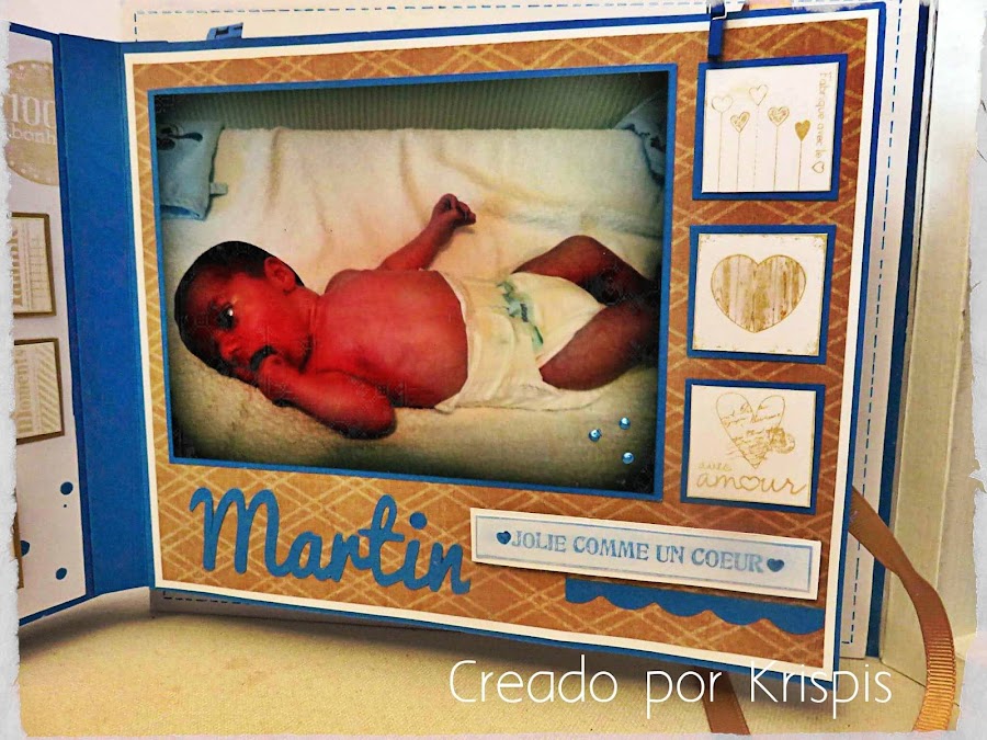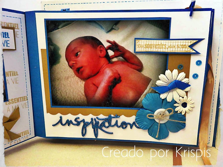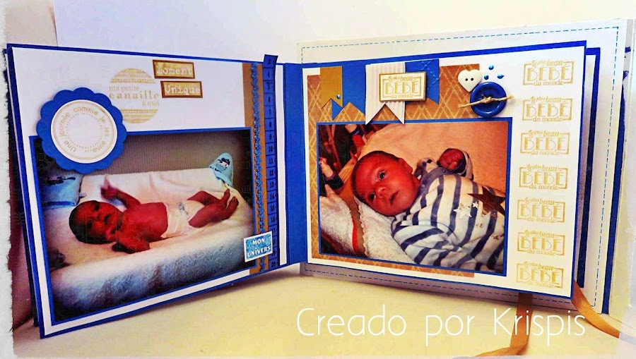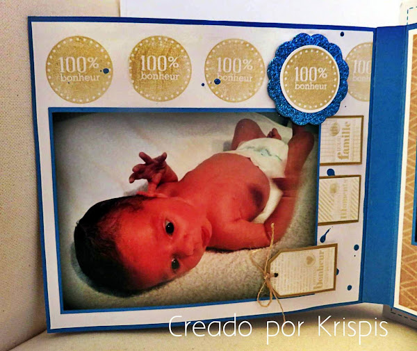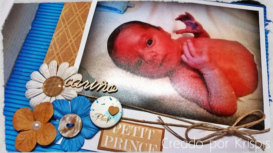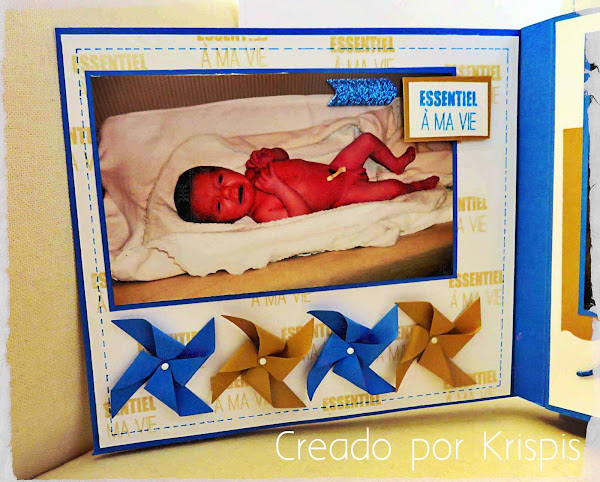 He utilizado diferentes elementos en tonos azules, craft y blancos. He hecho fondos con pasta de stencil, acuarelas, sellos, me encanta combinar sobre fondo blanco esos tonos, también he usado papel corrugado, papeles de My minds eyes y elementos decorativos como botones, cintas, abecedarios... También use por primera vez las chapas y maderitas que ha creado mi amiga Leti de http://gigietmoi.blogspot.com.es/, son una pasada son de papel acuarela, para que podamos crear nuestras chapas, me encantan.