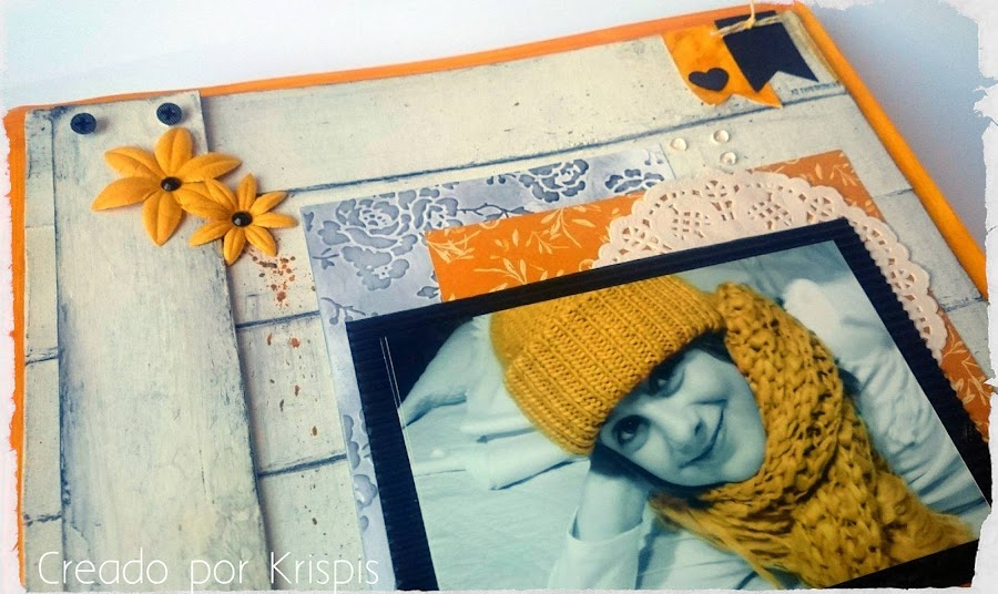 Bueno pues me puse manos a la obra y esto fue lo que salio, es un layout que hace efecto madera aunque realmente es cartón de encuadernar, me encanta el efecto que queda con las chalk Paint, he usado papeles de Prima Marketing, flores sellitos y diferentes adornos.