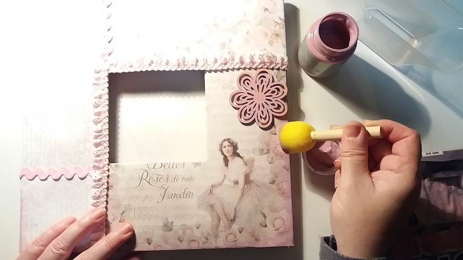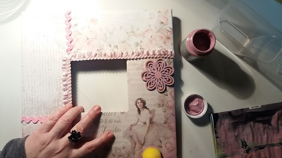 Aquí, comienza mi " vena" romántica y primero con el pincel de espuma le fui dando a todo alrededor.