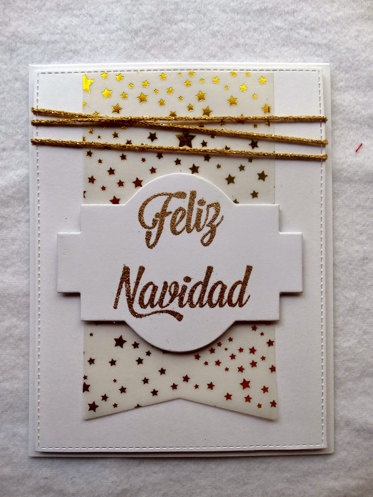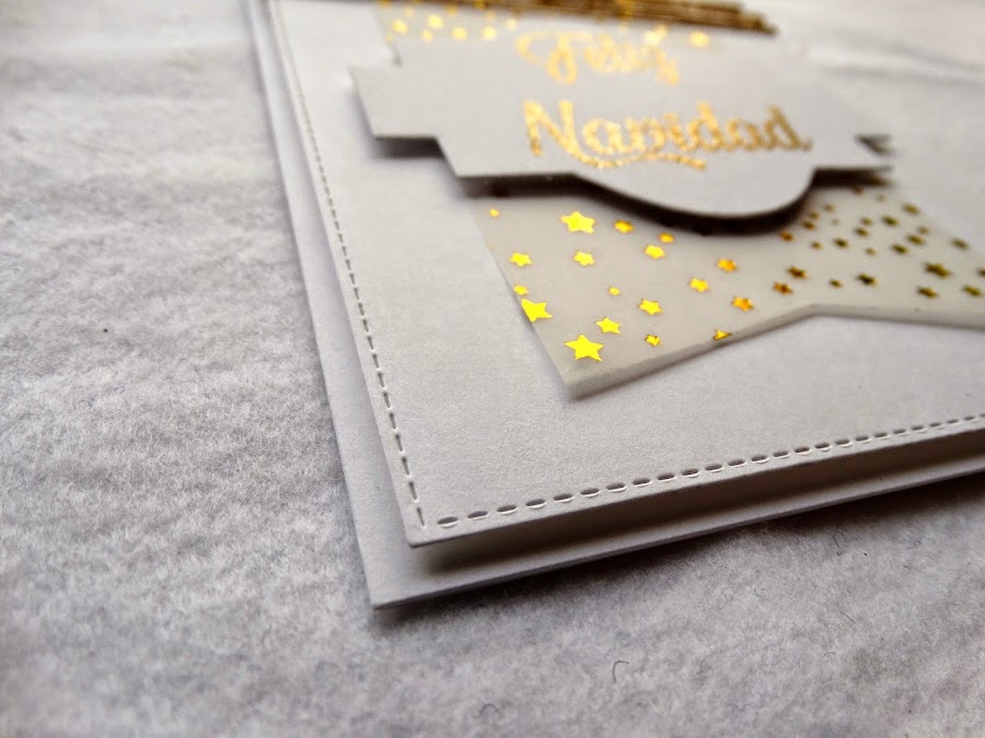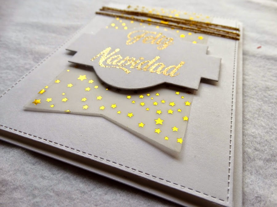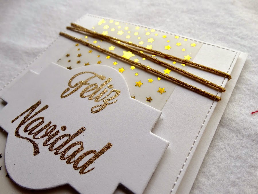 Como veis, he usado el mismo troquel de la Big Shot para la etiqueta y el mismo sello de La Pereja Creativa, pero esta vez con polvos de emboss dorados con purpurina y detrás, una banderola de papel vegetal o vellum con estrellitas doradas, de Studio Cálico, que fue ver ese papel y enamorarme! Y, como viene siendo habitual últimamente, un poco de hilo, dorado esta vez.
