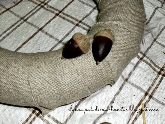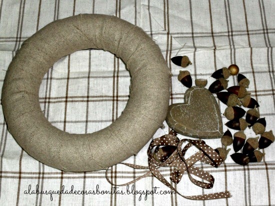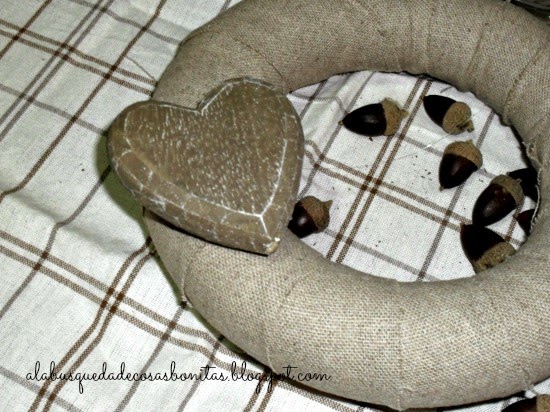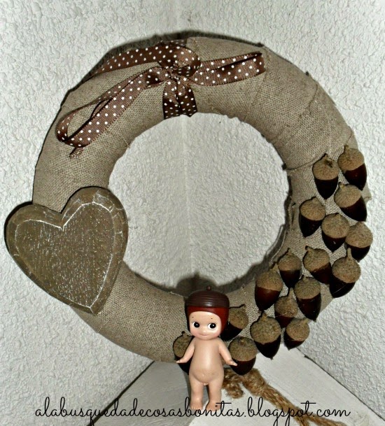 Y hace tres fines de semana, fuimos a ver a unos familiares, cuyo jardín estaba repleto de bellotas marrones. Así que puse a mi trío a recolectar bellotas, con la condición de que estuvieran maduras, porque mientras comíamos una paella de esas que quitan el sentido se me ocurrió la idea: una corona otoñal con bellotas marrones.