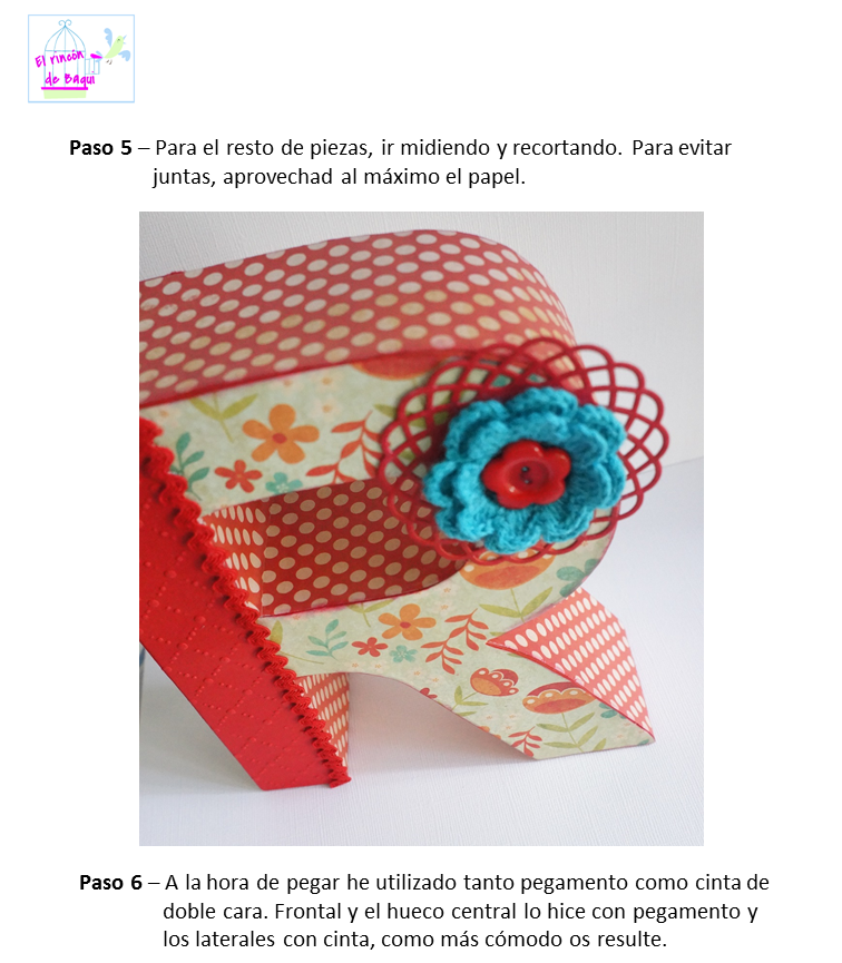 Para la decoración utilicé una blonda, que tinte con Color Box (color Ruby), una flor de ganchillo (el azul turquesa rompe y sigue los tonos del papel estampado) y un botón rojo. La cartulina roja lleva embosing frío, rematando la unión una cinta zigzag.