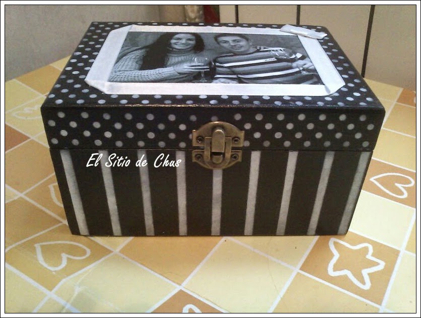Y aquí el trabajo que yo presento para el mismo. Se trata de una caja de madera que regalé a unos novios el día de su boda. Fue en ella donde metí el dinero que les regalábamos. Usé la técnica del decoupage para la foto, y el stencil para los puntitos, rayas y pajaritos de dentro.