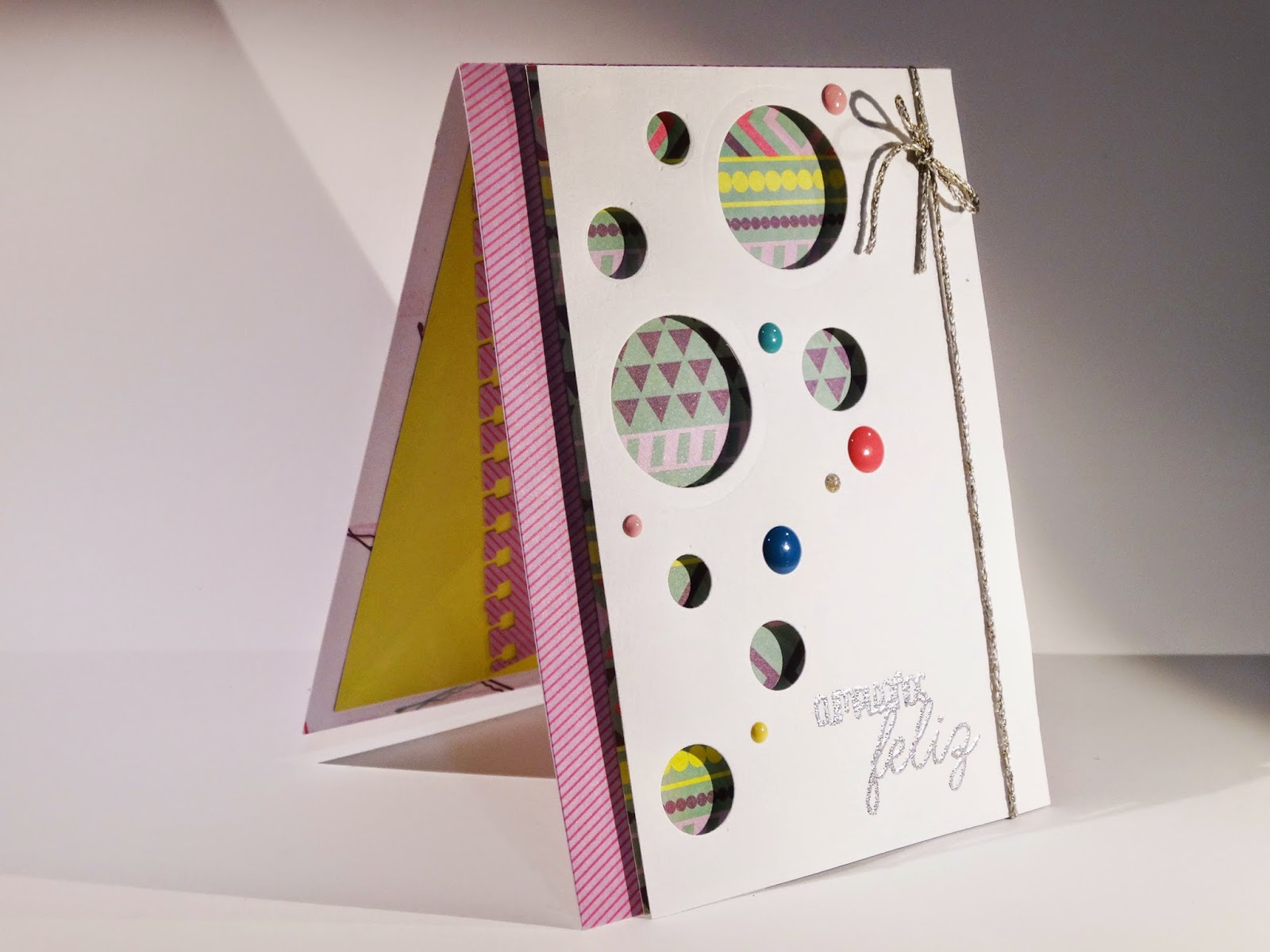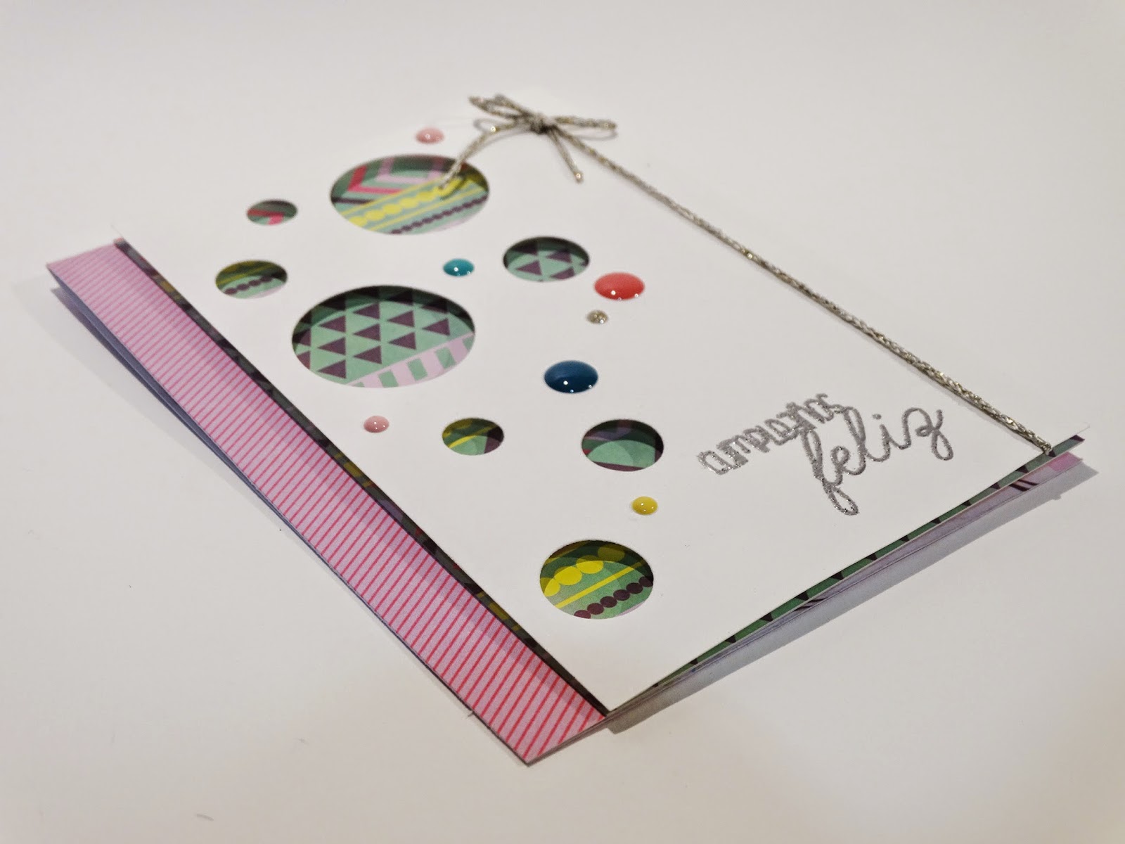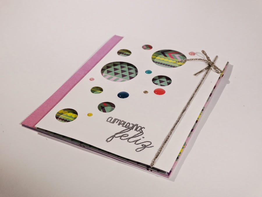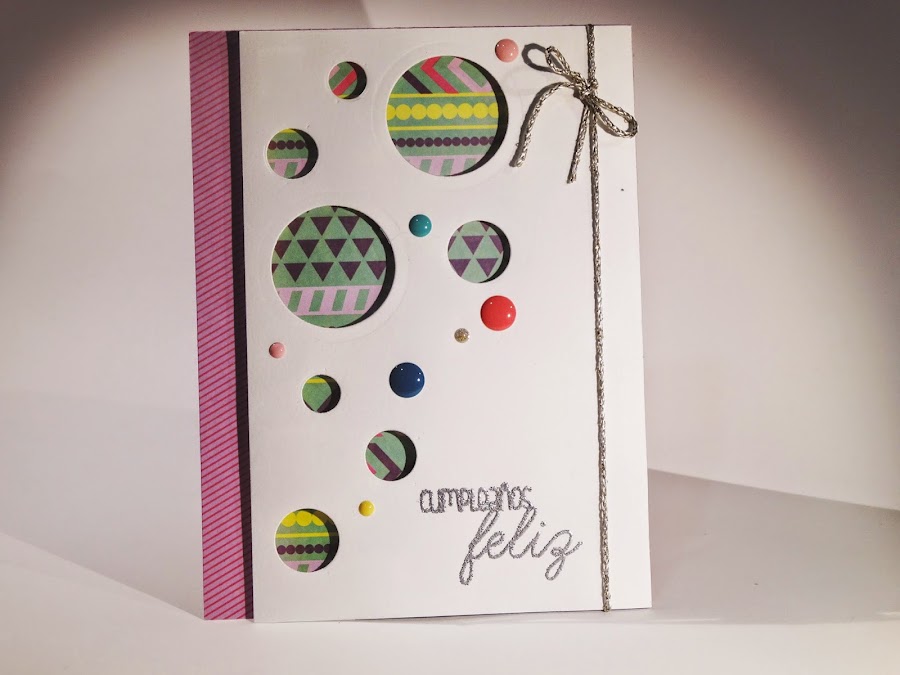 Como podéis ver en el título, yo escogí usar enamel dots, círculos y washi tape. aunque el washi lo he usado en el interior de la tarjeta. Y, además, también usé algo de Yoy Scrap, el sello de "cumpleaños feliz".