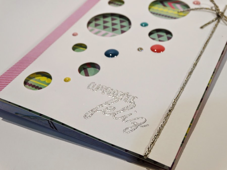 Para realizarla, he troquelado distintos círculos de diferentes tamaños y luego he pegado mi cartulina blanca a un papel decorado con adhesivos 3D. Para el sello de Yoy Scrap he usado tinta versamak transparente y polvos de emboss plateados con purpurina. Un cordoncito plateado y unos enamel dots. Eso es todo.