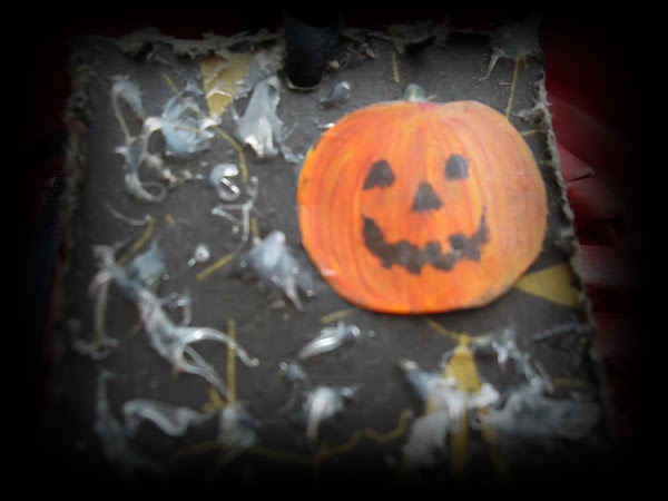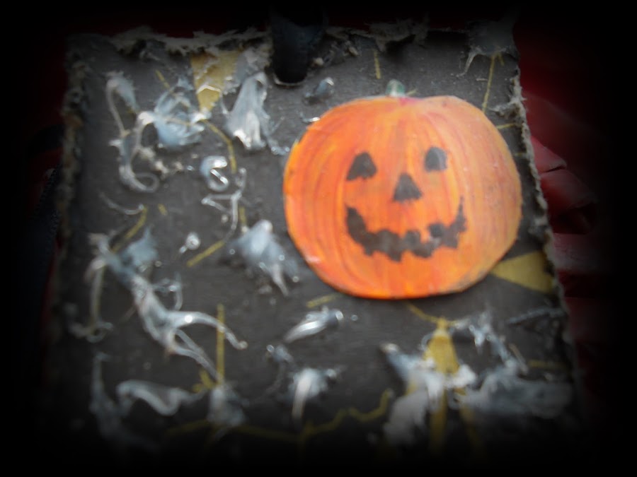 Una vez realizado el decoupage, me dibujé una pequeña calabaza sobre una cartulina, recorte y pinté con acrílicas. La pegue con silicona fría, poniendo bastante cantidad para darle forma y pegarla en relieve.