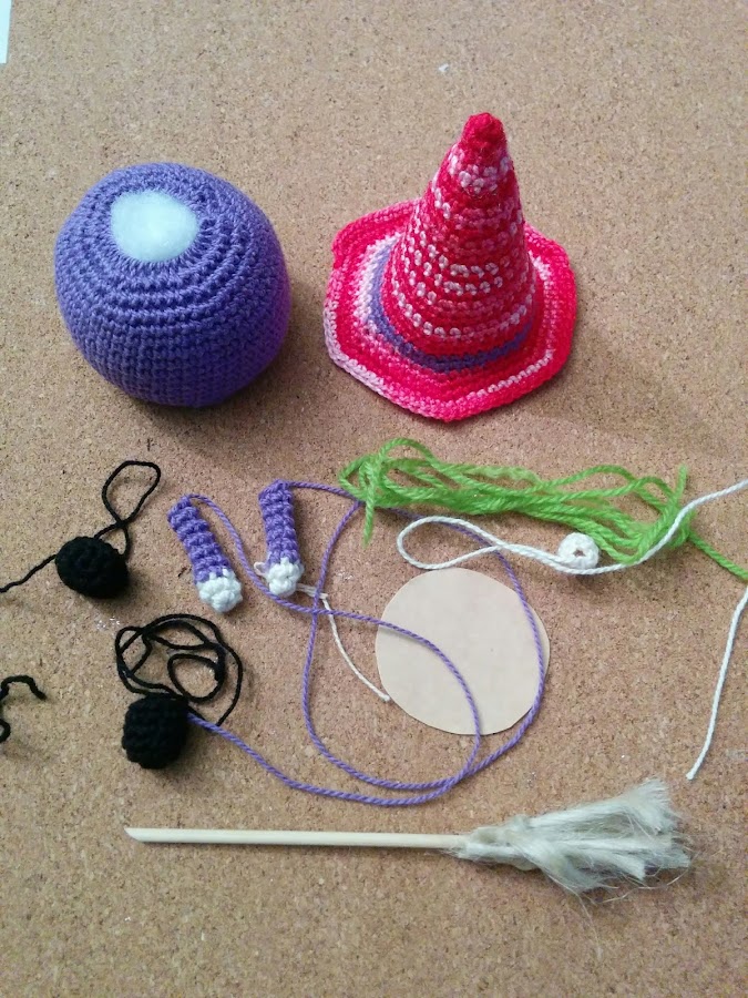 Como es mi costumbre no he realizado más que esta foto en la que se pueden ver las piezas que componen la bruja. Después de confeccionar todas las piezas los brazos y los pies (las bolitas negras) están cosidas y el resto pegadas con silicona caliente.