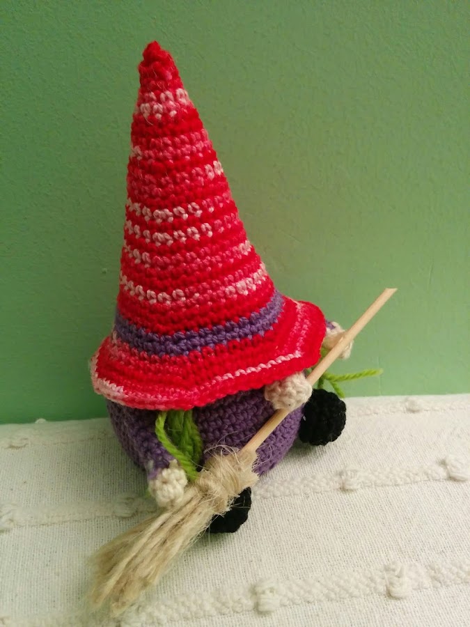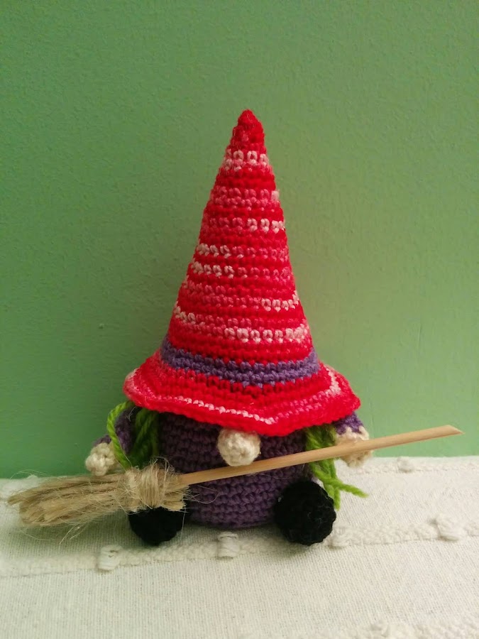 Esta gnomo bruja sigue el modelo y las instrucciones que se encuentran en el blog windingroad crochet. Está un poco distinta pero creo que ha quedado muy graciosa.