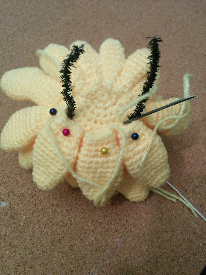 Los ojos los he puesto móviles pero en el modelo los pinta y las antenas las he colocado después de colocar la peluca base y son un trozo de limpiapipas con unas bolitas de madera como final.