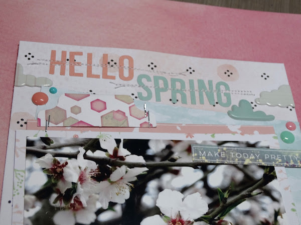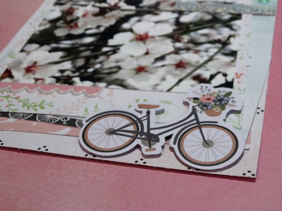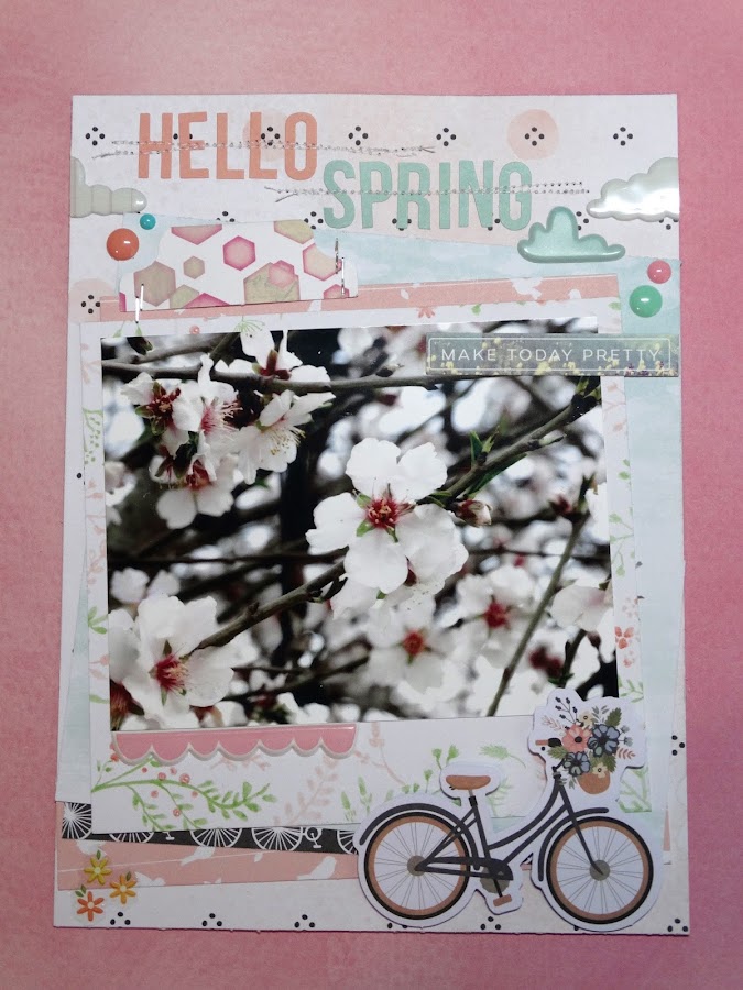 He usado una foto de unas flores de almendro que hice hace unos meses como punto focal y luego he hecho el LO usando varias capas de papel decorado y algunos stickers como decoración.