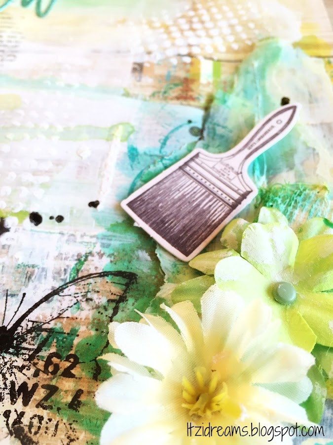 Para el fondo he utilizado la colección Nest de Webster’s Pages, es perfecta para trabajar el Mix media, para complementar el fondo he dado unos toques de acuarelas y sellos Finnabair.
