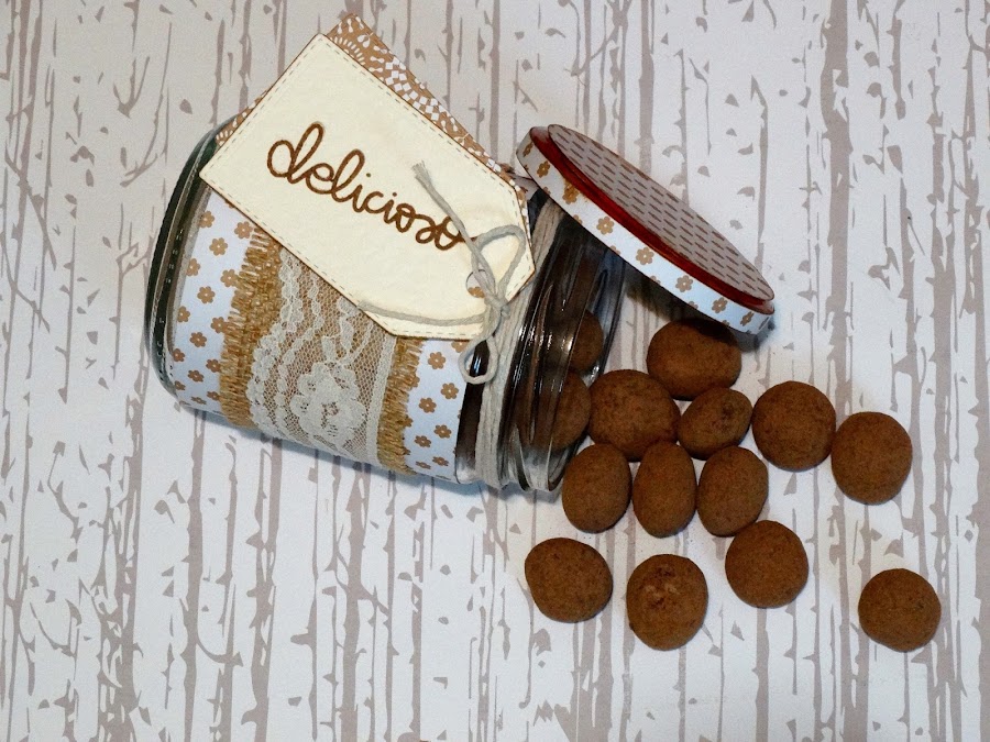 Al final, dandome una vuelta por San Pinterest se me ocurrió que podía alterar un tarro para poner dentro unas catanias (unos dulces típicos de mi pueblo que si no habéis probado, os convido a que lo hagáis, porque están riquisisisissisismas!!!!! Os dejo la web donde podéis comprar on line Bombons Cudié).