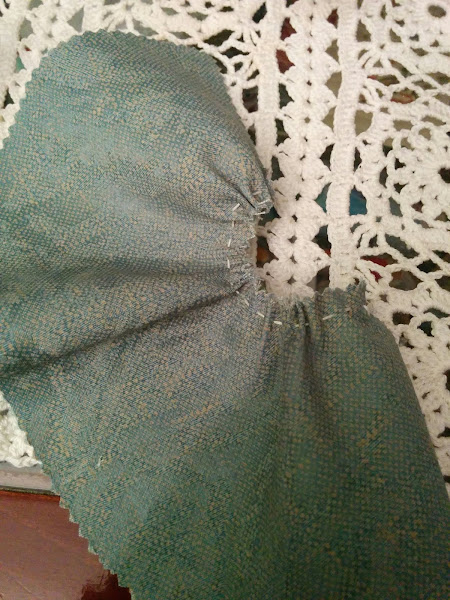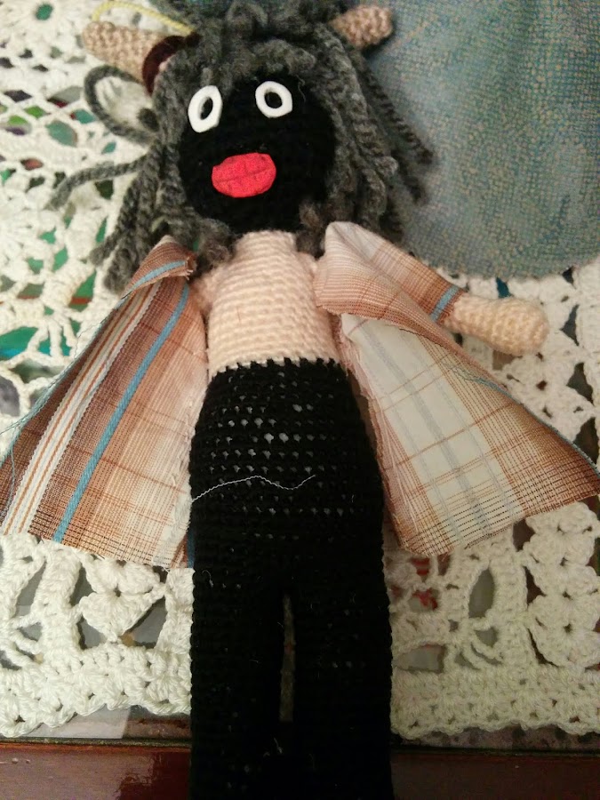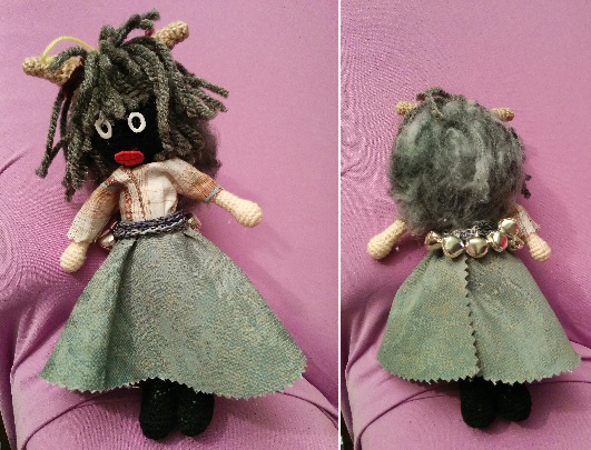 Cosida y colocada en el muñeco le puse un cordón que también estaba por una caja de las que tiene mi madre con botones y cintas. Detrás lleva unos cencerros sujetos al cinturón pero no tenía cencerros pero si que tenía unos cascabeles grandes que me trajo mi hermana precisamente para hacer este muñeco, así que los cosí al cordón.