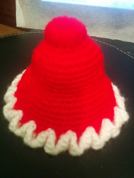 En las dos siguientes vueltas hacemos 3 puntos bajos y un aumento durante toda la vuelta. y completamos el cuerpo de la campana completando 9 vueltas con un punto en cada punto bajo. Cambiamos de color y hacemos la cenefa, como es complicada de explicar sin dibujos os animo a que veáis el video que los enseña de maravilla.
