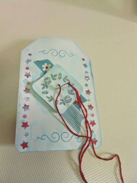 El embossing lo he aplicado en un cuadradito de cartulina, que posteriormente he cosido al tag con un hilo rojo.