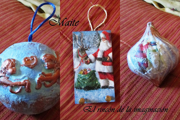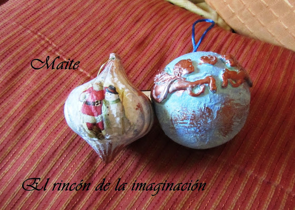 Este adorno navideño era una bola de máquina. La cubrimos con trozos de servilletas y después le dimos una capa de gesso blanco,le pusimos unos angelitos de pasta de modelar .Pintamos todo de azul y a continuación con pintura metalizada dimos unos reflejos .