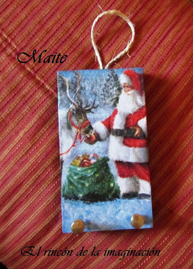 Finalmente ,esta perchita reciclando un trozo de madera,de un palet,lo lijamos,le dimos selladora ,adorné con una servilleta navideña y para que no se notara el cote de servilleta la integré con pintura, formando parte del paisaje. Para terminar la percha ,pusimos estos dos tornillos con base.