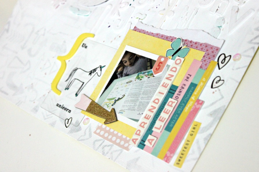 Los adornos son de la colección Cute Girl de Crate Paper, que es súper colorida y le iba bastante bien al fondo