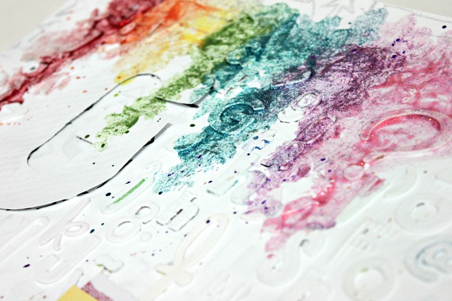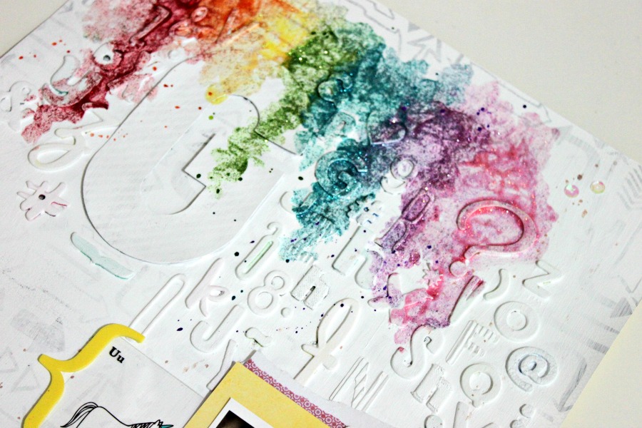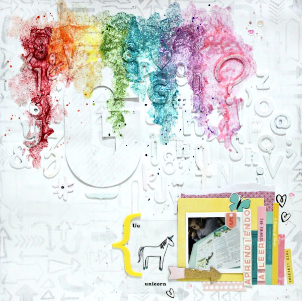 Yo me he fabricado un fondo con letras de distintos abecedarios, lo he pintado de blanco y encima he guarreado un poco con los tonos del arco iris de las pinturas glitter de Martha Stewart ;)