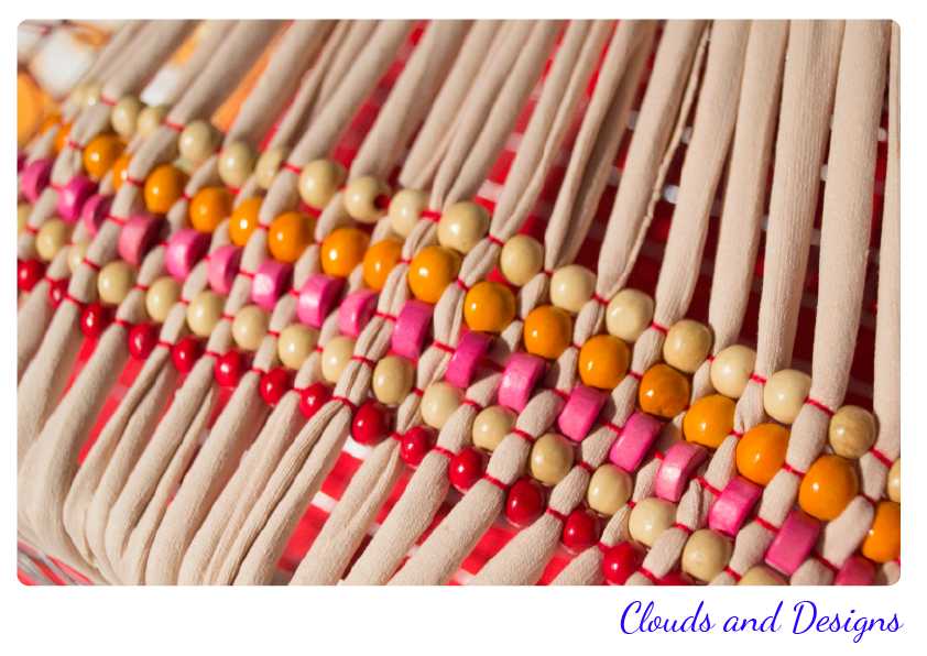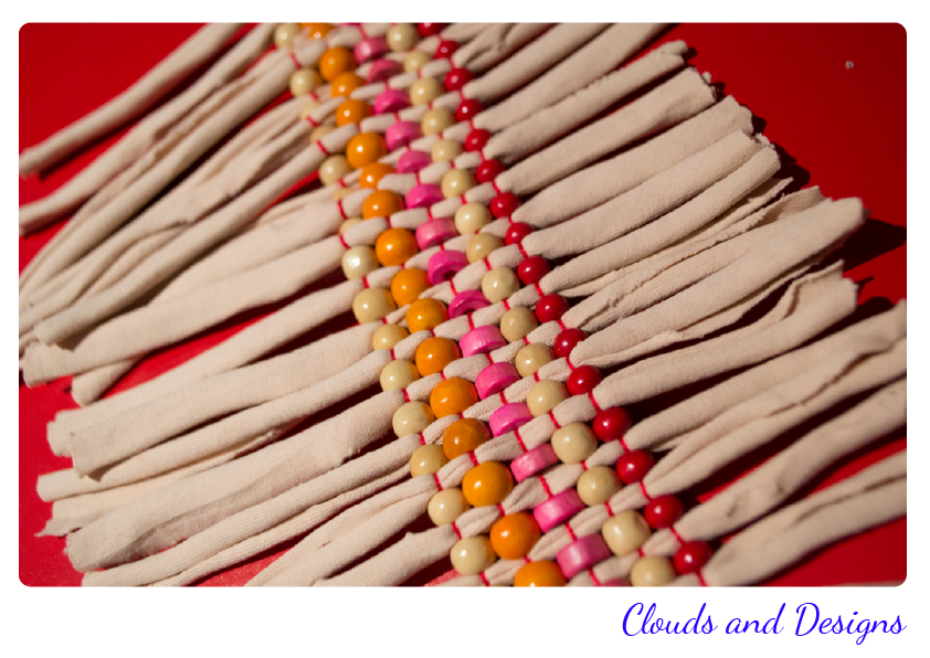 Después he hecho un segundo intento que tampoco me ha terminado de convencer. Y es que me acordado que de pequeña tejía con abalorios y hacia pulseras y he intentado adaptarlo al telar con trapillo, y este ha sido el resultado?