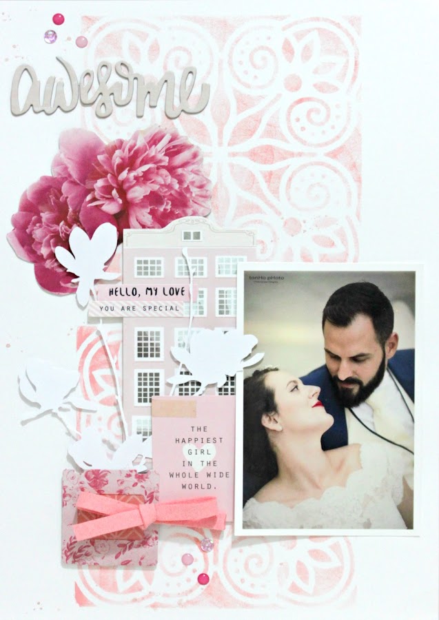 Me he inclinado por una página tamaño A4 en color blanco, he creado un fondo con stencil y tinta he añadido un par de recortes en los mismos tonos.