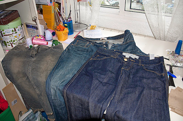 Pues estas chicas han tenido tanto éxito con su propuesta que han decidido hacer una segunda entrega para que pudiese participar todo el mundo que no llego o no se entero primero, y como no, a mi que me entusiasma reciclar pues también me he apuntado a esta segunda entrega, y que se me ha ocurrido esta vez?? esta vez no tenia suficientes pantalones para hacer lo que tenia en la cabeza, así que hice un llamamiento a mis compis de curro que son de lo mas mejor del mundo (soy muy afortunada por tenerlas) y al día siguiente tenia material suficiente para poder llevar a cabo mi tarea, concretamente he necesitado 3 pantalones y una falda vaquera, aquí os dejo foto del antes...