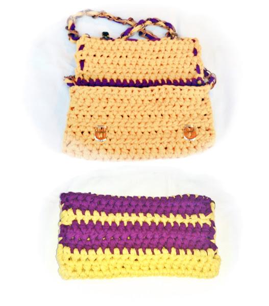 La verdad es que no tenía la intención de hacer el bolso de trapillo, pero como siempre me pasa últimamente acabo empezando las cosas tarde, y cuando me doy cuenta ya no me da tiempo a hacer lo que había pensado en un primer momento. así que aprovechando que aún tenía por casa algún ovillo de Miss kits en color amarillo y algunos restos morados al final me decidí a probar con estos dos colores y acabé haciendo un pequeño bolso de mano tipo clutch, pero con cadena.