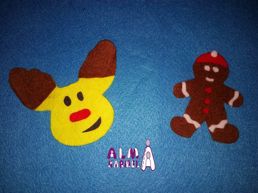 En fieltro han elegido estos muñecos, una galleta de jenjibre, un reno y dos muñecos de nieve.