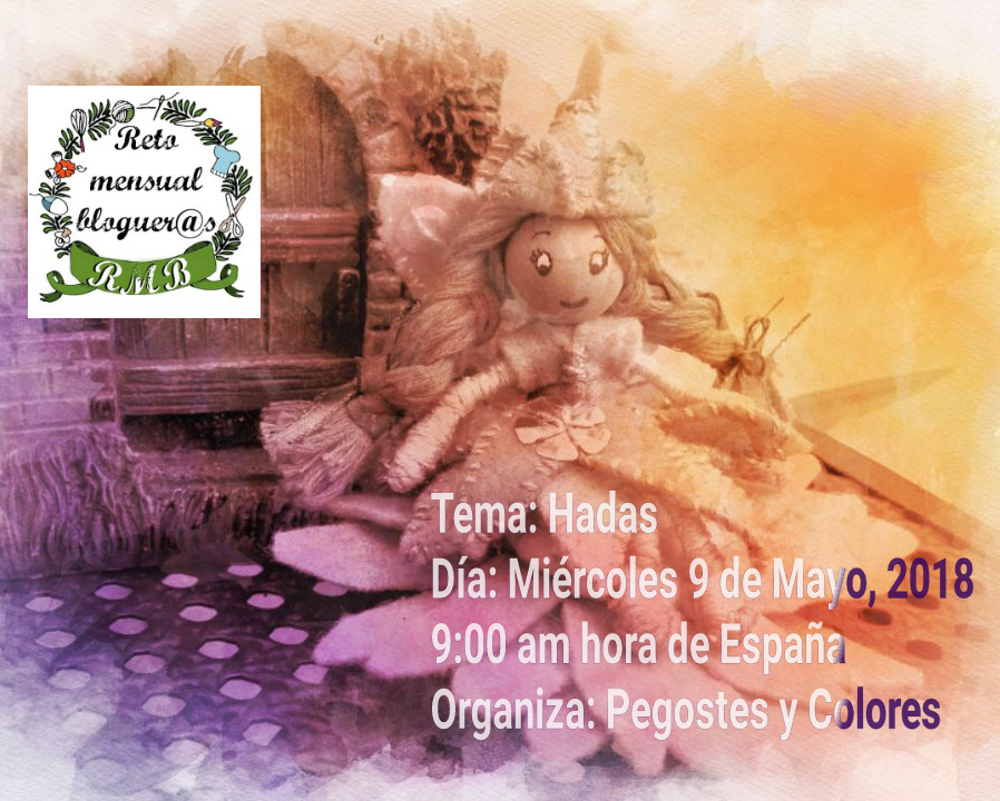 - El primero es el Reto Mensual Blogur@s que organiza Diana del blog Pegotes y Colores, con un tema precioso "Hadas", está casi a las puertas de la presentación ya que tenemos de plazo hasta el día 7 de mayo por la diferencia horaria, la aportación hay que hacerla el 9 de mayo a las 9 de la mañana, hora europea. Justo, justo de tiempo pero aun hay tiempo.