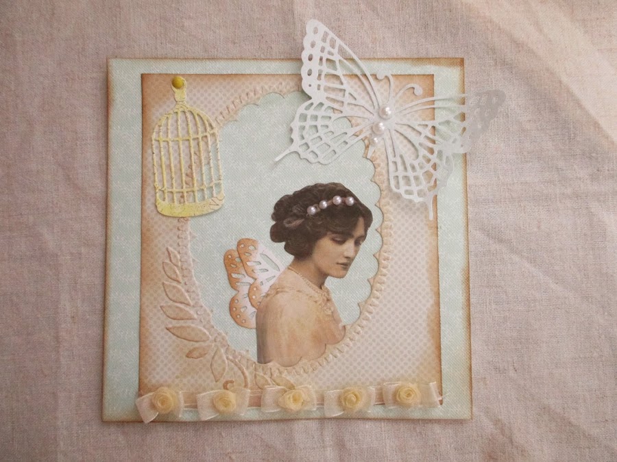 He tomado unos papeles de la marca"Lillibet" en tonos agua y textura ropa, uno de los papeles lo he embosado con la carpeta del ovalo,el otro hará de soporte, una vez embosado he utilizado el Die más grande en forma de ovalo para cortar y así formar una especie de porta retratos, luego he entintado todos los bordes y el embosado con tinta Distress Vintage, he imprimido unas imágenes de damas de época años 20, la he recortado y entintado, con un troquel de mariposa de Martha, la he cortado por la mitad para poder pegarlas separadas a la espalda de la imagen, después he decorado con perlitas tanto la diadema como la mariposa de troquel grande de "Marianne", un brad sujetando un mini troquel de jaula y una cinta de rosas en color beig han finalizado el trabajo, espero que os guste y si tenéis alguna duda preguntad, la responderé encantada.