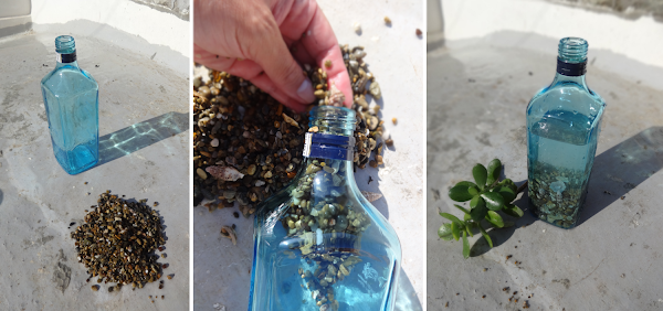 Del mar he tomado piedras, conchas y caracoles pequeñitos, esto ayuda a dar peso a la botella. Las plantas lo mismo, tomadas de aquí y allá