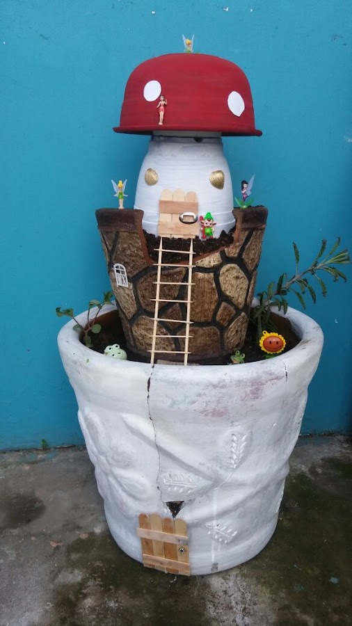 Encima he colocado otra maceta rota que tenía también para reutilizar, unas escaleras de palitos y después he hecho una especie de casita hongo para mis hadas del bosque, las pegue con silicón caliente, agregamos un par de plantas pequeñas y dos ranas graciosas