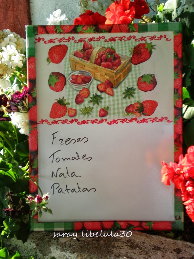 Esta pizarra es de esas blancas para pintar con rotulador. Decore el marco con dos tipos de servilletas .Para pegar la servilleta en la pizarra lije un poquito luego pegue la servilleta , después pinte al rededor para integrar la servilleta , puse las fresas de los lados y hice un esténcil con una plantillas de cenefas. le di barniz para proteger y listo