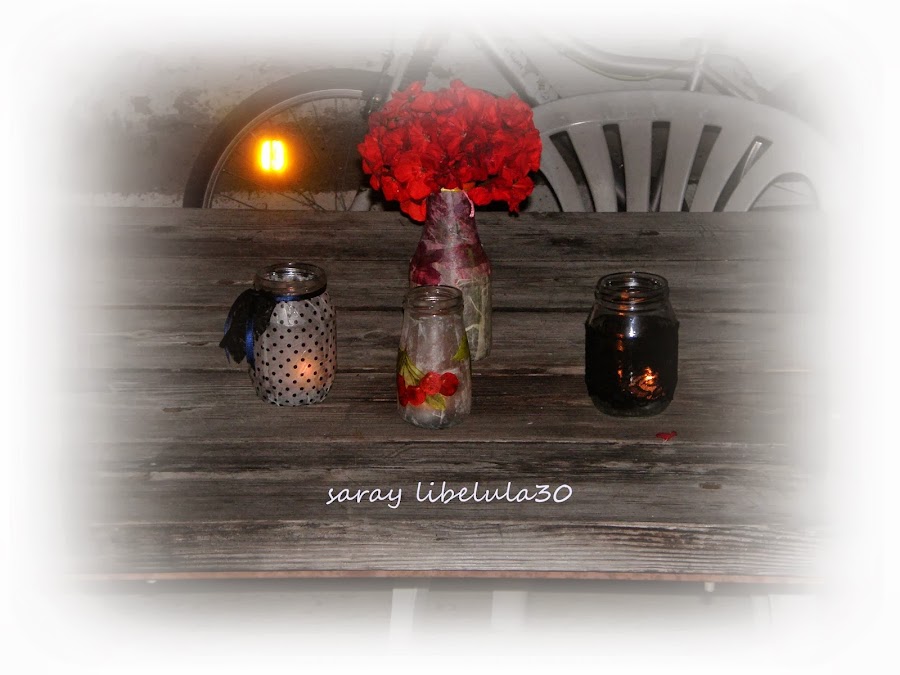 Reutilizando unos botes, unos porta velas para amenizar una velada al aire libre y un florero para la mesa .