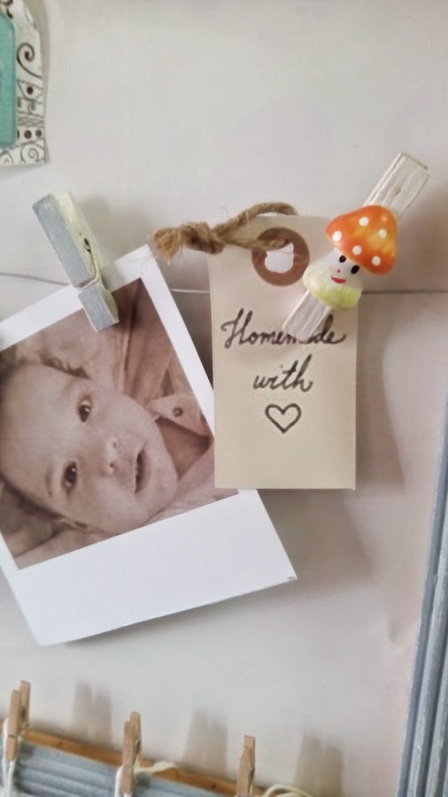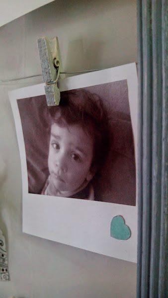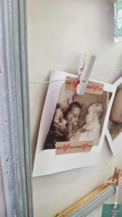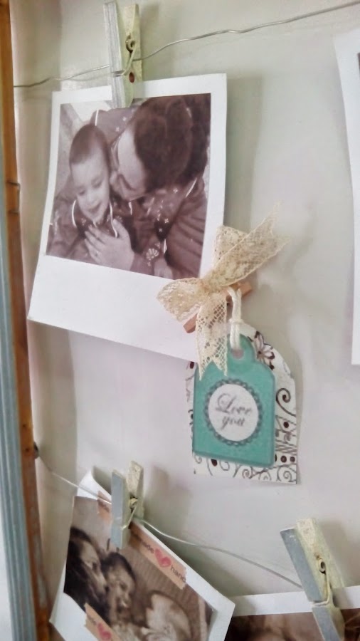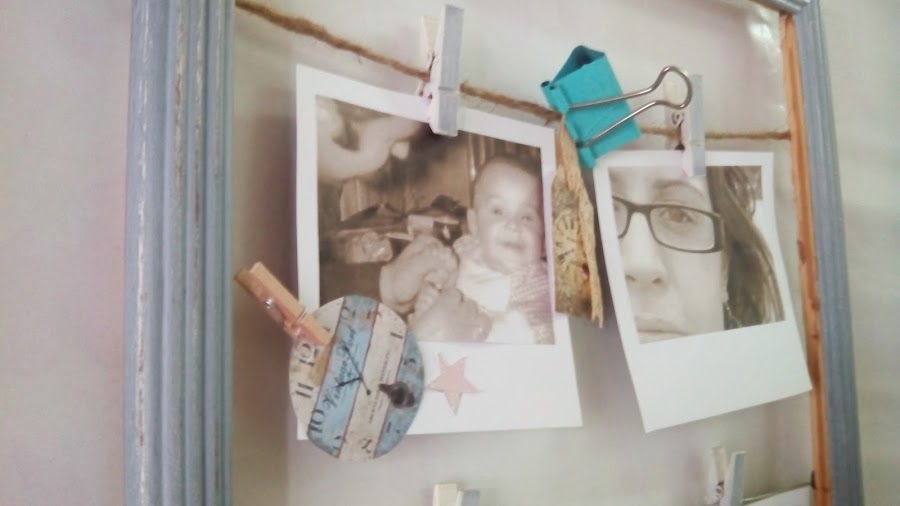 Le quité el metal y salio una estructura en madera natural, ideal para empezar a trabajar, le di una capa marrón suave, luego otra blanca y finalmente un tono gris que me encanta, lijé algunos puntos para darle ese aire desgastado que tanto me gusta, puse unos alambres de punta a punta sujetos con chinchetas, y una cuerdecita... Colgué algunas fotos (he de decir que las polaroid las creé yo con cartulina... no os vayáis a pensar...) y un par de chuminadas más, y, ahí lo veis!
