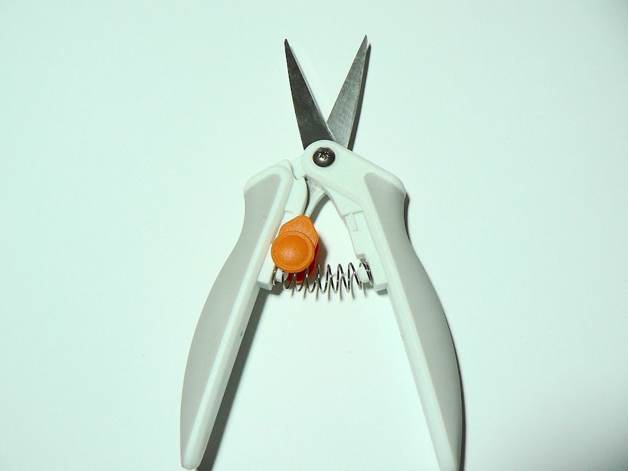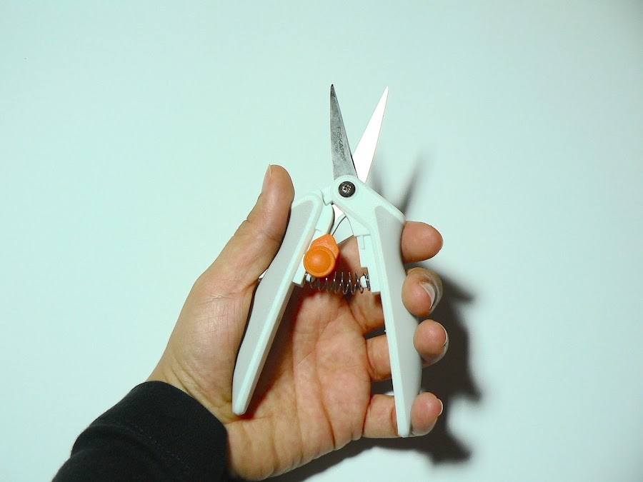 Son unas tijeras de estilo cizalla, es decir, no tienen agujeros para meter los dedos, llevan un muelle en el medio y se agarran por los mangos. Pueden recordarte a unas tijeras de podar, por ejemplo.