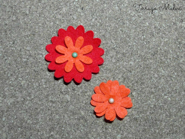 Aquí pueden verse otras flores que he troquelado en fieltro de colores. También he utilizado brads para el centro, pero en un tamaño pequeño.