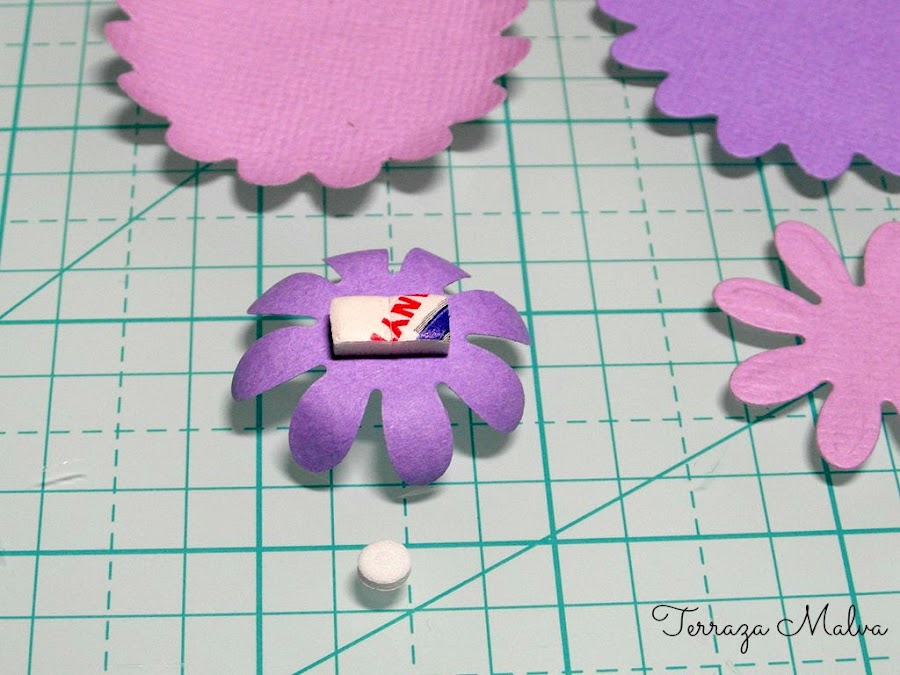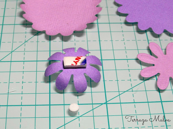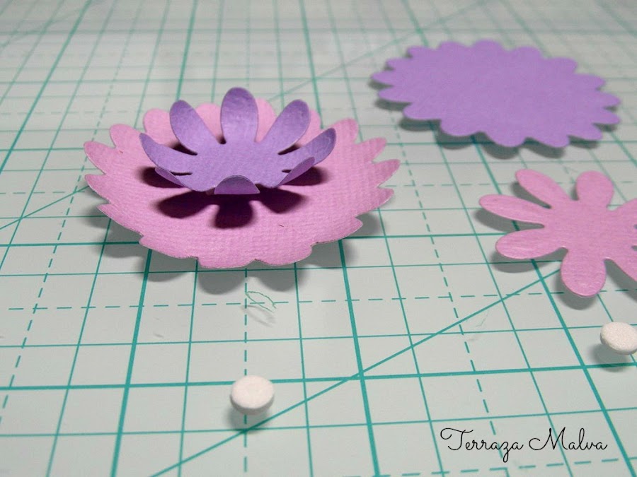 Para conseguir más volumen en la flor he pegado el troquelado pequeño sobre el grande con foam 3D .
