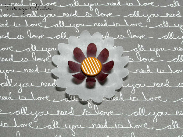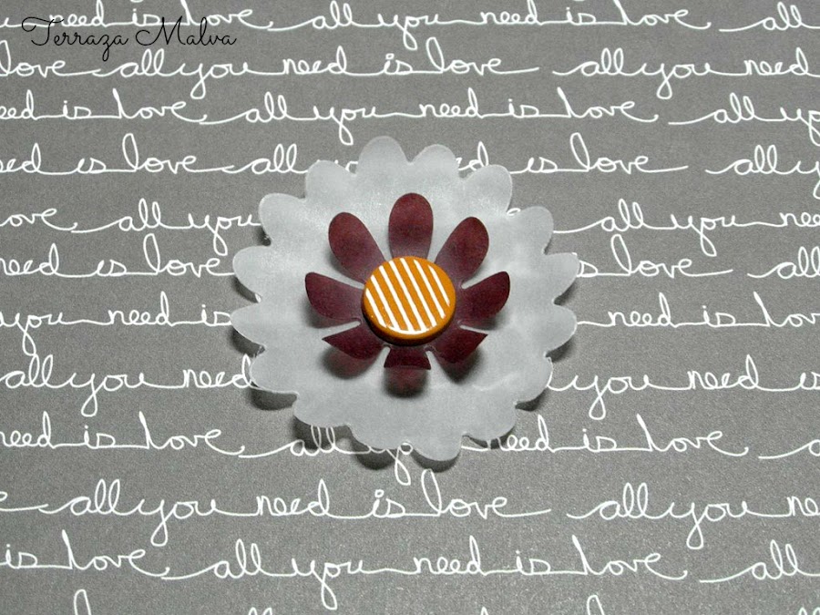En la foto superior tenéis una flor que he realizado con vellum blanco y vellum granate. Como centro de la flor he utilizado esta vez un brad grande que le da un aspecto totalmente diferente.