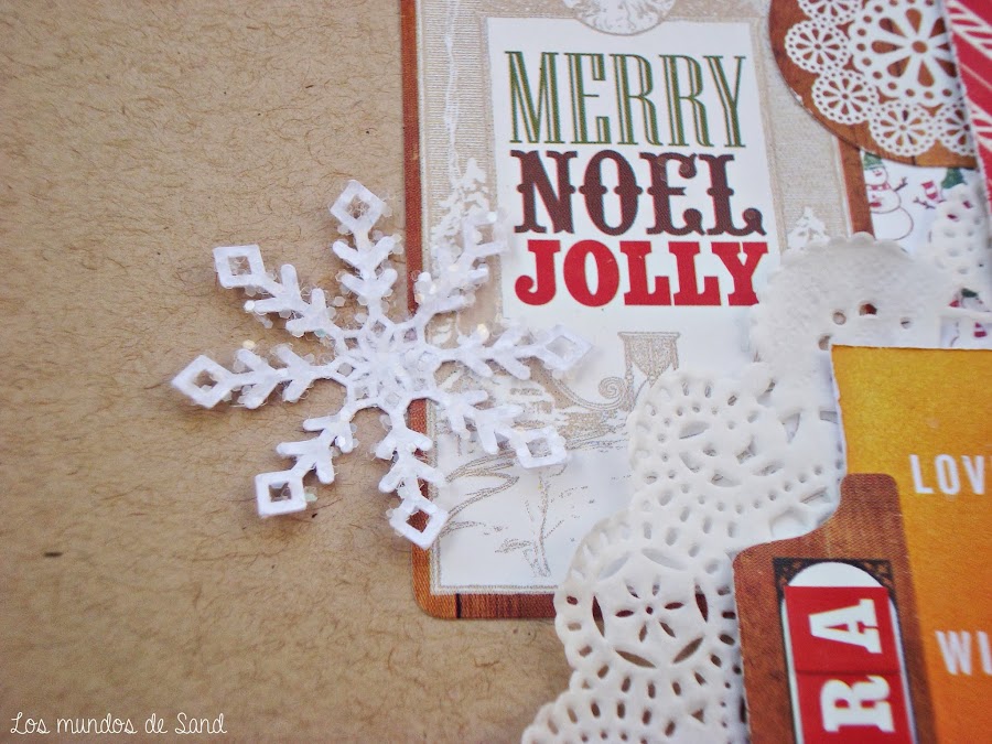 Para ello preparé una lamina muy navideña con mi pequeña Noel, cuando tenía seis mesecitos. La paleta de colores que he utilizado es el rojo, verde, kraft, blanco y algo de naranja.