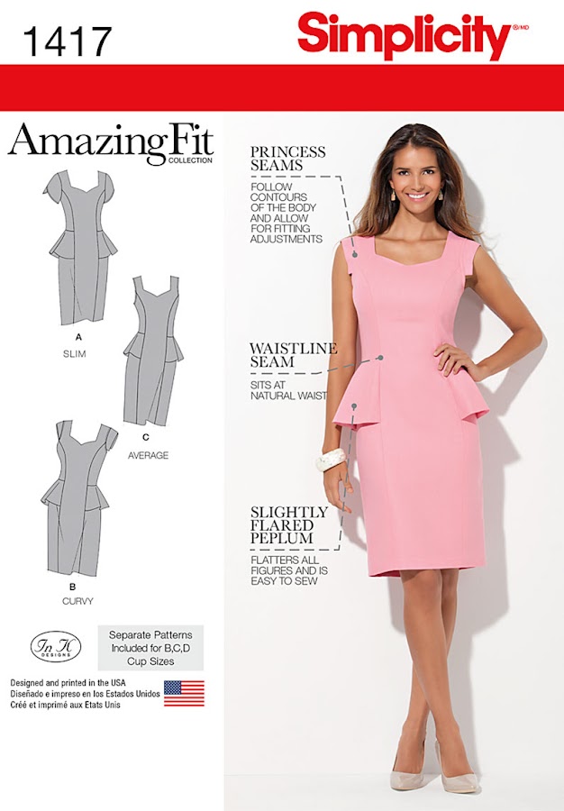 Simplicit 1417: tres versiones de un vestido, en las tallas 46 - 50, y de nuevo lo que ne gusta no está en mi talla, pero si aumpliar una talla no me da pereza a disminuir 3 no me atrevo. Esta patrón es de la linea Amazing Fit, me cosi una falda hace un tiempo de la mosma linea y la verdad es que me sienta de maravilla!: