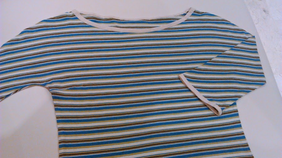El sencillo patrón y su posterior confección me resultaron muy fáciles. Rematé todos los bordes (escote, mangas y bajo) con cinta al bies de un color beige similar a una de las rayas, y el resultado fue éste: