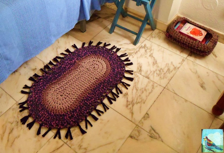 Yo he utilizado tres trapillos distintos y aguja del 12. El trapillo del fondo aunque no se ve en la foto es de un color grisáceo claro, luego he empleado un color tierra y le he puesto una lista de dos vueltas en azul marino con motivos rosas.