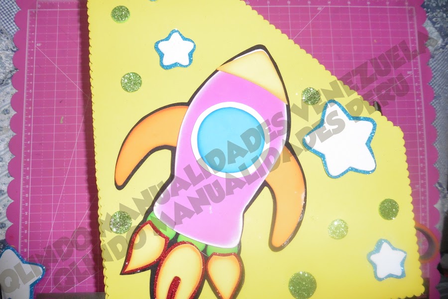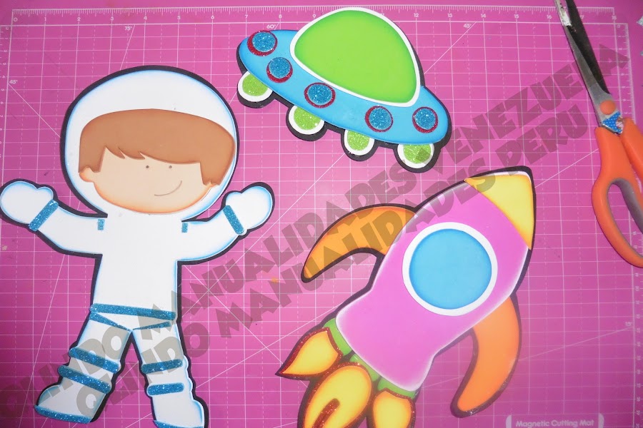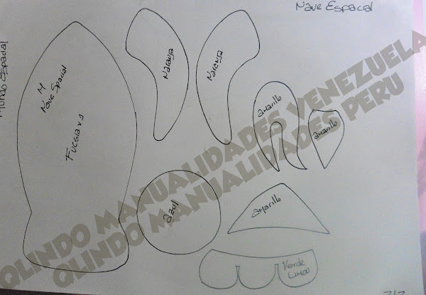 2. Para la nave espacial cortamos las piezas en colores de microporoso brillantes, observa en la foto como he sombreado las piezas y darle un toque diferente a las piezas.