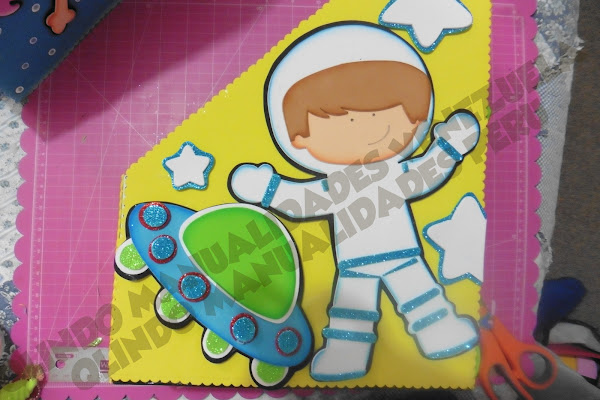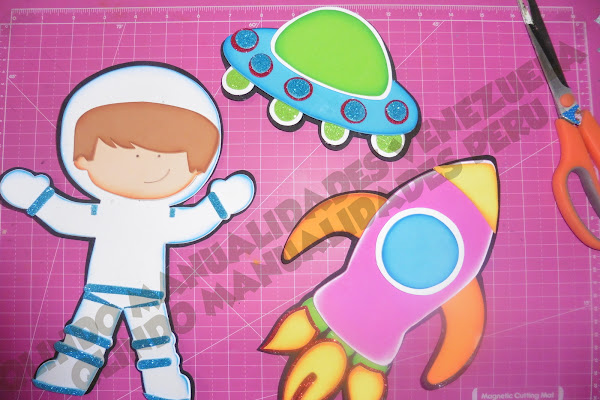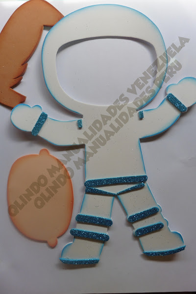 1. Para el astronauta cortamos las piezas de acuerdo al color del microporoso guíandote por los moldes, observa en la imagen de abajo que corte tiras de microproroso escarchado azul y sobree la pieza con pintura acrílica celeste, al igual que el cabello y la cabeza esta sombreado con pinturas acílicas de acuerdo al color del microporoso.