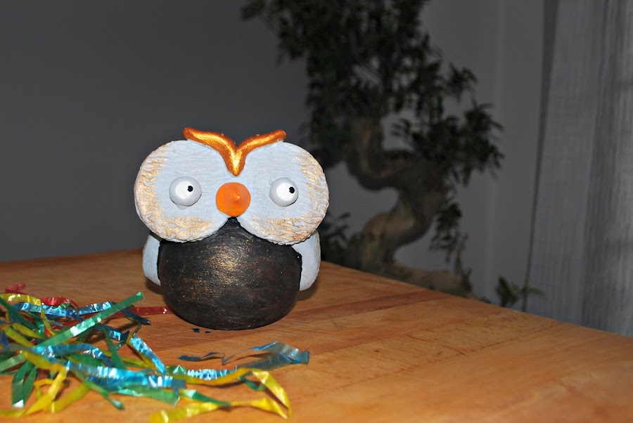 Y, ¡por último! Otto el búho portavelas, que viene volando desde Alemania ni más ni menos y que descansa -no sobre el bonsai- sino sobre las estanterías de mi salón mirando de reojo a alguno de los libros. ¡Que bonito que es!