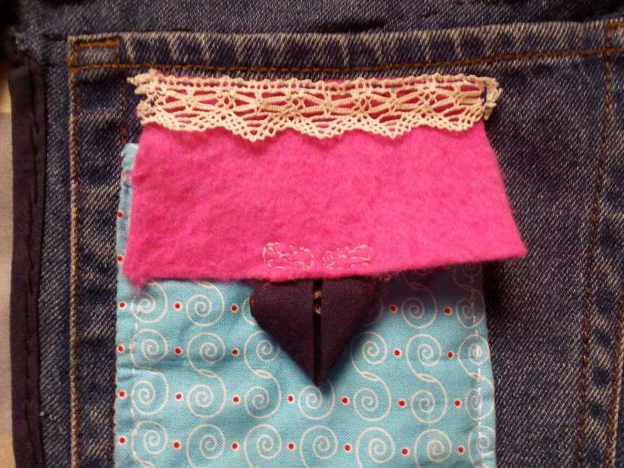 Ahora cortamos otro retal para poder cerrar el bolsillo que acabamos de crear, en este caso use filtro rosa, lo cosí en el bolsillo a unos 2 cm de la abertura, le añadí un encaje y una cinta para poder cerrar el bolsillo.